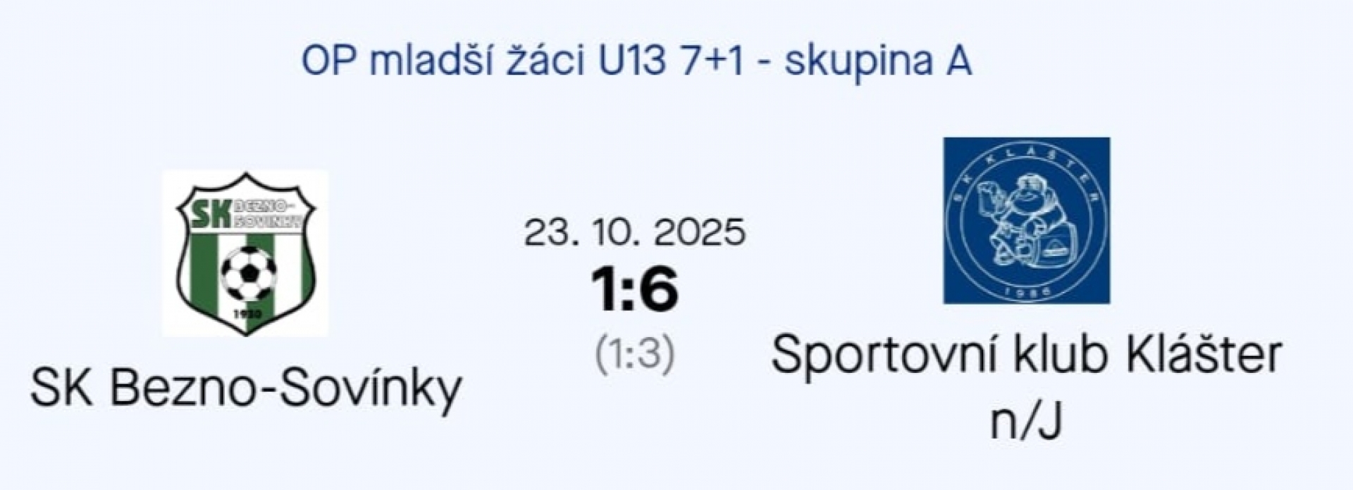 Mladší žáci dnes doma podlehli Sk Klášter n/J vysoko 1:6 ( 1:3 ). Jedinou branku našeho týmu vstřelil Filip Dabski.